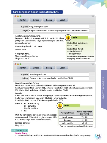 102 • Guru membimbing murid untuk mengira Kadar Nadi Latihan (KNL) seperti yang • Guru membimbing murid untuk mengira 60%-80% Kadar Nadi Latihan (KNL) masing-masing. 103