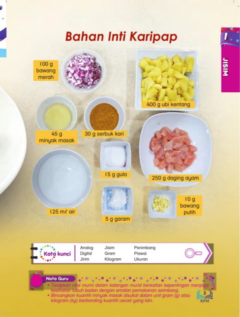 • Bincangkan kuantiti minyak masak disukat dalam unit gram (g) atau 3