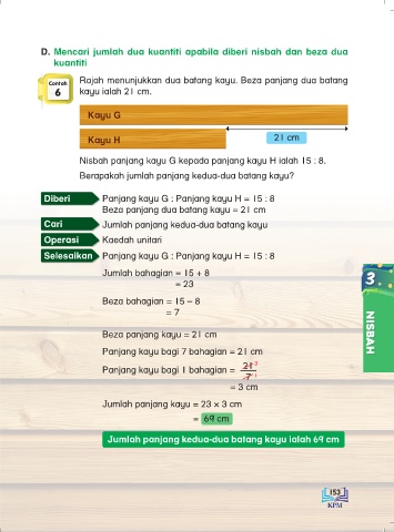 Nisbah panjang kayu G kepada panjang kayu H ialah 15 : 8.