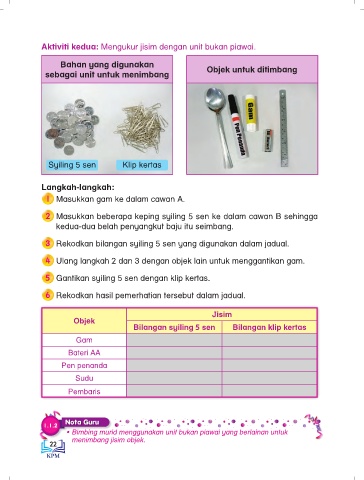 Aktiviti kedua: Mengukur jisim dengan unit bukan piawai.