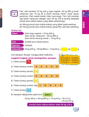 Pak Latif membeli 23 kg 450 g baja organik, 50 kg 800 g tanah