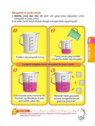 2. Isi padu cecair boleh disukat dengan menggunakan jag penyukat.