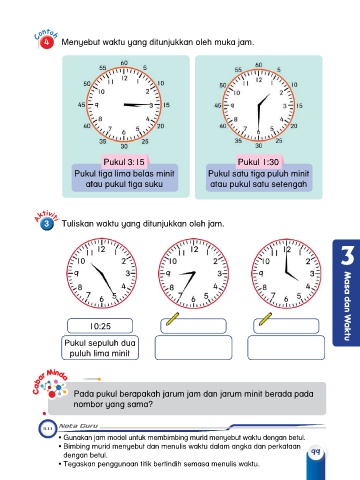 • Gunakan jam model untuk membimbing murid menyebut waktu dengan betul.