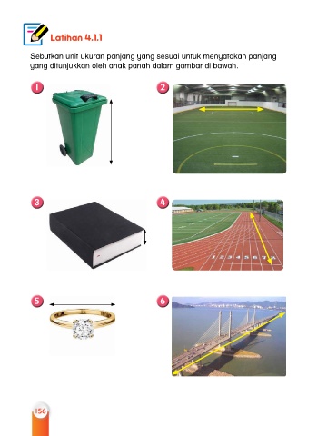 Latihan 4.1.1 Sebutkan unit ukuran panjang yang sesuai untuk menyatakan panjang yang ditunjukkan oleh anak panah dalam gambar di bawah. 1 2 3 4 5 6 156