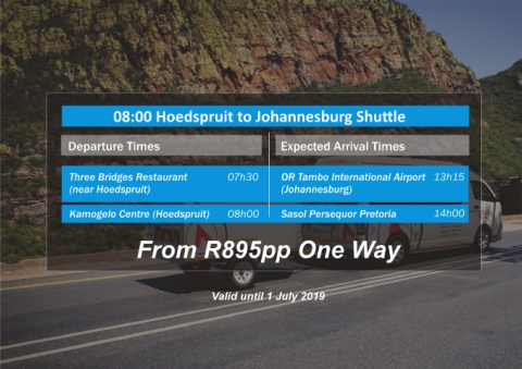 Three Bridges Restaurant 07h30 OR Tambo International Airport 13h15