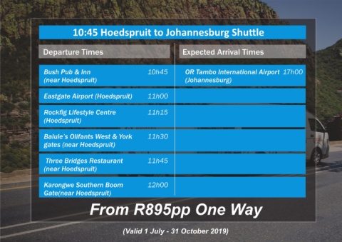 Bush Pub & Inn 10h45 OR Tambo International Airport 17h00