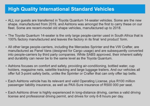 Ÿ Each Ashtons vehicle has its relevant and valid Operating License, plus R100 million