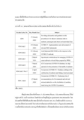 ตารางท 10-1 จดหมายเวียนจาก IMO แก่ประเทศสมาชกเกียวกับโรคโควิท-19