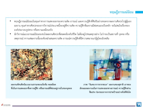• ทฤษฎีอารมณ์นิยมเน้นคุณค่าทางการแสดงออกของความคิด อารมณ์ และความรู้สึกที่ศิลปินถ่ายทอดจากผลงานศิลปะไปสู่ผู้มอง