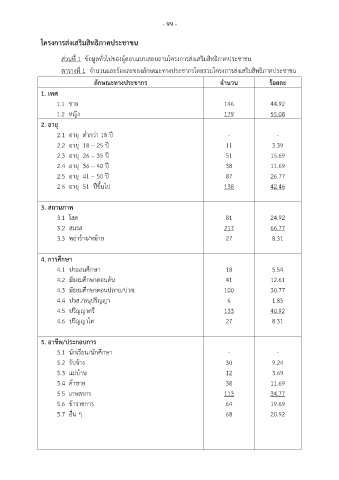 ตารางที่ 1 จ านวนและร้อยละของลักษณะทางประชากรโดยรวมโครงการส่งเสริมสิทธิภาคประชาชน