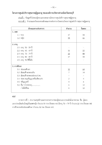 ตารางที่ 1 จ านวนและร้อยละของลักษณะทางประชากรโดยรวมโครงการศูนย์บริการสุขภาพผู้สูงอายุ