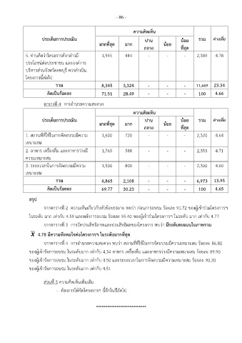 จากตารางที่ 4 การอ านวยความสะดวก พบว่า สถานที่ที่ใช้ในการจัดอบรมมีความเหมาะสม ร้อยละ 86.80