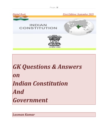 P a g e | 1 Digital Book First Edition: September 2019 GK Questions & Answers on Indian Constitution And Government Laxman Kumar