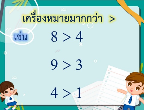 เครื่องหมายมากกว่า > เช่น 8 > 4 9 > 3 4 > 1