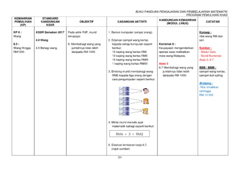 3. Bimbing murid membahagi wang jumlahnya tidak lebih sampel wang kertas,