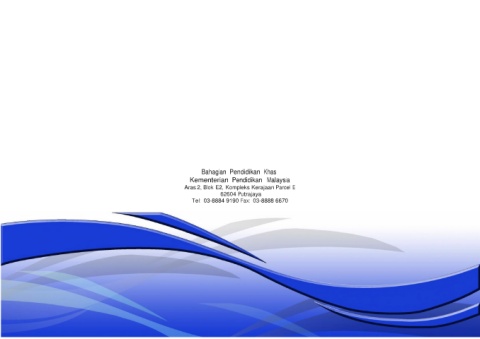 Bahagian Pendidikan Khas Kementerian Pendidikan Malaysia Aras 2, Blok E2, Kompleks Kerajaan Parcel E 62604 Putrajaya Tel: 03-8884 9190 Fax: 03-8888 6670