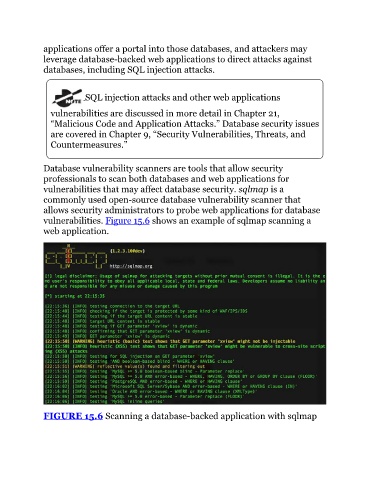 vulnerabilities. Figure 15.6 shows an example of sqlmap scanning a