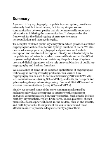 This chapter explored public key encryption, which provides a scalable