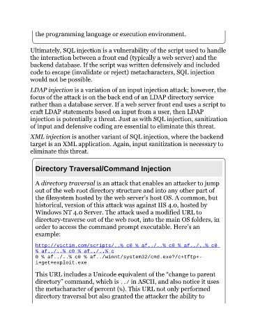 injection is potentially a threat. Just as with SQL injection, sanitization
