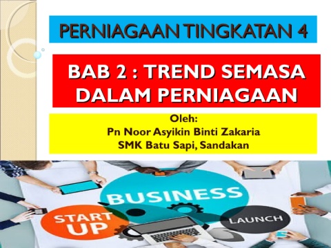 PERNIAGAAN TINGKATAN 4 PERNIAGAAN TINGKATAN 4 BAB 2 : TREND SEMASA BAB 2 : TREND SEMASA DALAM PERNIAGAAN DALAM PERNIAGAAN Oleh: Pn Noor Asyikin Binti Zakaria SMK Batu Sapi, Sandakan