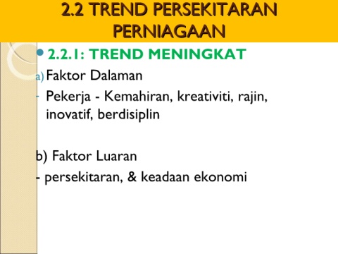 2.2 TREND PERSEKITARAN 2.2 TREND PERSEKITARAN PERNIAGAAN PERNIAGAAN 2.2.1: TREND MENINGKAT a)Faktor Dalaman - Pekerja - Kemahiran, kreativiti, rajin, inovatif, berdisiplin b) Faktor Luaran - persekitaran, & keadaan ekonomi