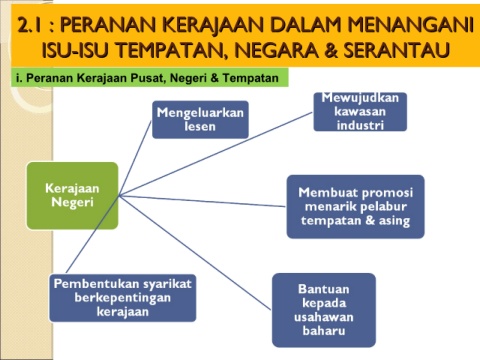 2.1 : PERANAN KERAJAAN DALAM MENANGANI 2.1 : PERANAN KERAJAAN DALAM MENANGANI ISU-ISU TEMPATAN, NEGARA & SERANTAU ISU-ISU TEMPATAN, NEGARA & SERANTAU i. Peranan Kerajaan Pusat, Negeri & Tempatan