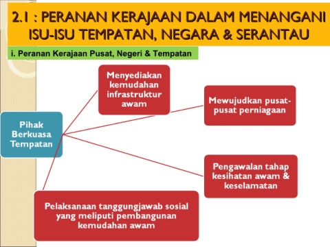 i. Peranan Kerajaan Pusat, Negeri & Tempatan