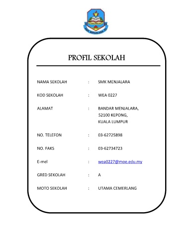 PROFIL SEKOLAH NAMA SEKOLAH : SMK MENJALARA KOD SEKOLAH : WEA 0227 ALAMAT : BANDAR MENJALARA, 52100 KEPONG, KUALA LUMPUR NO. TELEFON : 03-62725898 NO. FAKS : 03-62734723 E-mel : wea0227@moe.edu.my GRED SEKOLAH : A MOTO SEKOLAH : UTAMA CEMERLANG