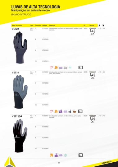 VE712GR Preta e 7 VE712GR07 Luva de poliéster com banho em látex nitrílico na palma e ponta 38.238 EN388:2003 x 10 x 240