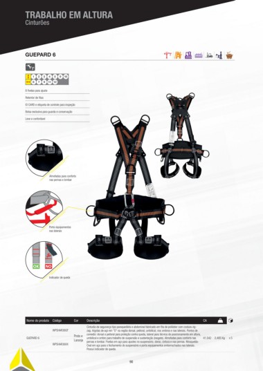 Preto e conexão: dorsal e peitoral para proteção contra queda, lateral para técnica de posicionamento em altura,