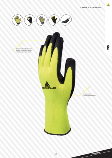 LUVAS DE ALTA TECNOLOGIA Banho em espuma de látex natural: • Flexível com excelente destreza • Respirante para maior conforto Cor fluorescente: • Visível a grande distância PREMUIM 67