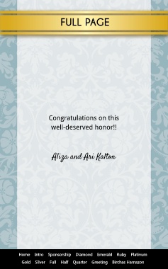 F88 Congratulations on this well-deserved honor!! Aliza and Ari Kalton Home Intro Sponsorship Diamond Emerald Ruby Platinum Gold Silver Full Half Quarter Greeting Birchas Hamazon
