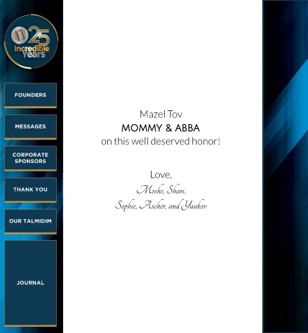 F 16 FOUNDERS Mazel Tov M O Y M & B A A B MESSAGES M MOMMY & ABBA on this well deserved honor! CORPORATE SPONSORS Love, Moshe, Shari, THANK YOU Sophie, Ascher, and Yaakov OUR TALMIDIM JOURNAL