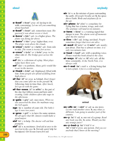 a•bout /ə bout′/ adv. somewhere near. She a•larm /ə lärm′/ n. a warning signal that