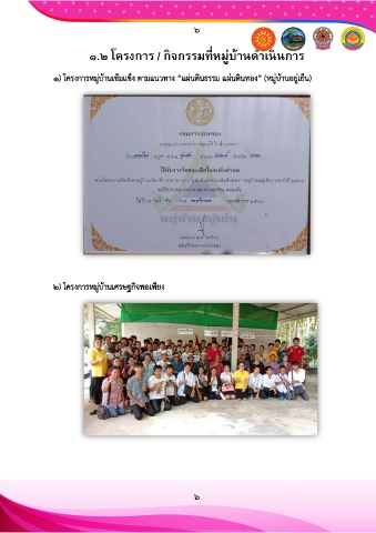 6 ่ ่ ี ๑.๒ โครงการ / กิจกรรมทหมูบ้านด าเนินการ ๑) โครงการหมู่บ้านเข้มแข็ง ตามแนวทาง “แผ่นดินธรรม แผ่นดินทอง” (หมู่บ้านอยู่เย็น) ๒) โครงการหมู่บ้านเศรษฐกิจพอเพียง 6