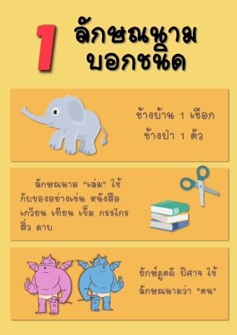1 ลักษณนาม บอกชนิด ช้างบ้าน 1 เชือก ช้างป่า 1 ตัว ลักษณนาม "เล่ม" ใช้ กับของอย่างเช่น หนังสือ เกวียน เทียน เข็ม กรรไกร สิ่ว ดาบ ยักษ์ภูตผี ปีศาจ ใช้ ลักษณนามว่า "ตน"