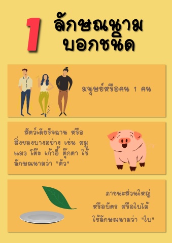 1 ลักษณนาม บอกชนิด มนุษย์หรือคน 1 คน สัตว์เดียรัจฉาน หรือ สิ่งของบางอย่าง เช่น หมู แมว โต๊ะ เก้าอี้ ตุ๊กตา ใช้ ลักษณนามว่า "ตัว" ภาชนะส่วนใหญ่ หรือบัตร หรือใบไม้ ใช้ลักษณนามว่า "ใบ"