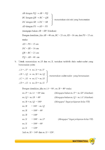 m∠Q = m∠B = 40 o (Mengapa bukan m∠Q = m∠A? Jelaskan)