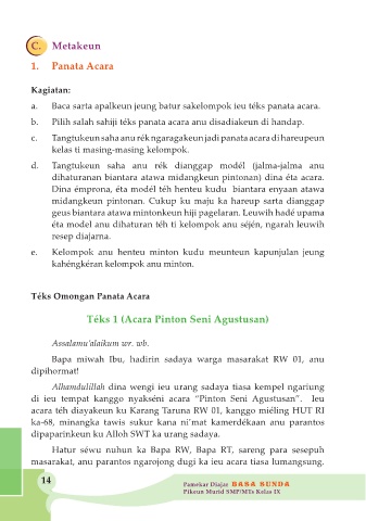 c. Tangtukeun saha anu rék ngaragakeun jadi panata acara di hareupeun