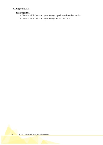 b. Kegiatan Inti 1) Mengamati 1) Peserta didik bersama guru menyampaikan salam dan berdoa. 2) Peserta didik bersama guru mengkondisikan kelas. 1 Buku Guru Kelas IX SMP/MTs Edisi Revisi 3