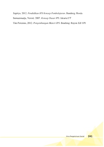 Sapriya. 2012. Pendidikan IPS Konsep Pembelajaran. Bandung: Rosda Sumaatmadja, Nursid. 2007. Konsep Dasar IPS. Jakarta:UT Tim Perumus, 2012. Pengembangan Materi IPS. Bandung: Rayon XII UPI Ilmu Pengetahuan Sosial 241
