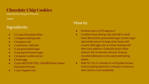 ● 2 cups NESTLE® TOLL HOUSE® Semi-Sweet ● Bake for 9 to 11 minutes or until golden brown.