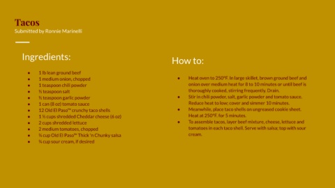 ● 12 Old El Paso™ crunchy taco shells ● Meanwhile, place taco shells on ungreased cookie sheet.
