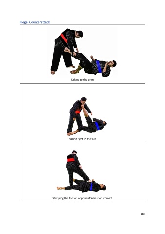 Illegal Counterattack Kicking to the groin Kicking right in the face Stomping the foot on opponent’s chest or stomach 186