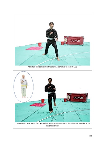 Athlete is still consider in the arena… (continue to next image) … However if the athlete lifted up the feet which was in the arena, the athlete is consider to be out of the arena. 195