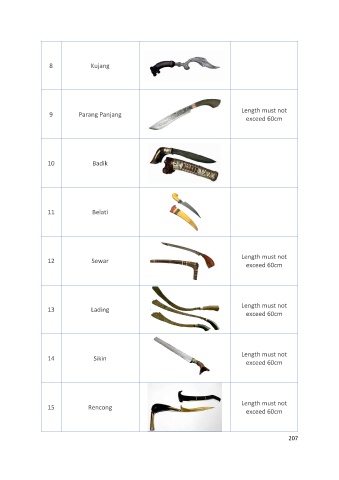8 Kujang Length must not 9 Parang Panjang exceed 60cm 10 Badik 11 Belati Length must not 12 Sewar exceed 60cm Length must not 13 Lading exceed 60cm Length must not 14 Sikin exceed 60cm Length must not 15 Rencong exceed 60cm 207