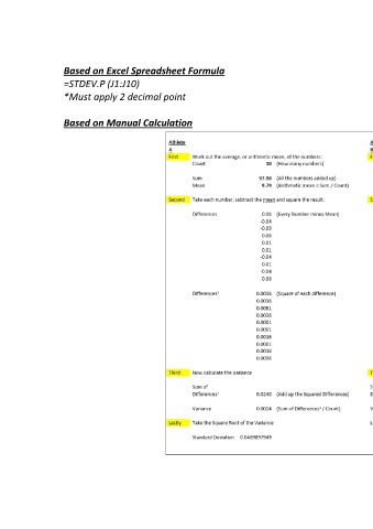 Based on Excel Spreadsheet Formula =STDEV.P (J1:J10) *Must apply 2 decimal point Based on Manual Calculation 211