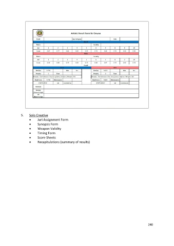 5. Solo Creative • Juri Assignment Form • Synopsis Form • Weapon Validity • Timing Form • Score Sheets • Recapitulations (summary of results) 240