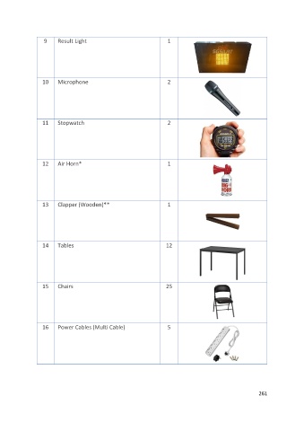 9 Result Light 1 10 Microphone 2 11 Stopwatch 2 12 Air Horn* 1 13 Clapper (Wooden)** 1 14 Tables 12 15 Chairs 25 16 Power Cables (Multi Cable) 5 261