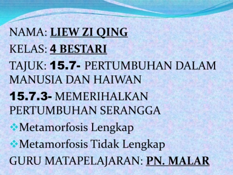 NAMA: LIEW ZI QING KELAS: 4 BESTARI TAJUK: 15.7- PERTUMBUHAN DALAM MANUSIA DAN HAIWAN 15.7.3- MEMERIHALKAN PERTUMBUHAN SERANGGA Metamorfosis Lengkap Metamorfosis Tidak Lengkap GURU MATAPELAJARAN: PN. MALAR